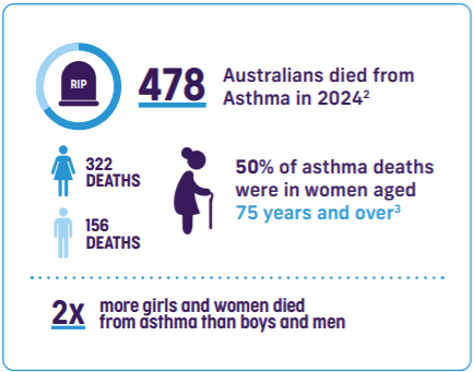 - National Asthma Council Australia. Asthma Mortality Statistics 2024 [cited 2025 Nov 25]. www.nationalasthma.org.au/living-with-asthma/resources/health-professionals/infographics/asthma-mortality-statistics-2024